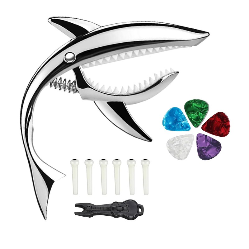 - 【Guitar Capo】This electric guitar capo is a fun design compared to the average capo, it has a very distinctive shape, good weight, and a strong but gentle grip. The silicone insets ensure clean dampening of your strings and this shark capo is easy to place and it staus in place