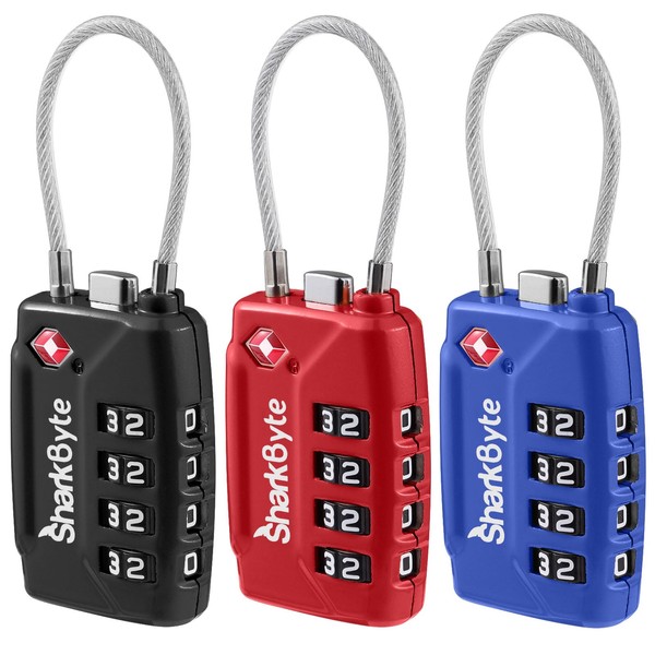 SharkByte TSA Approved Luggage Locks - 4-Digit Combo, (3 Pack) Flexible Cable for Suitcases & Bags (10,000 Combinations)