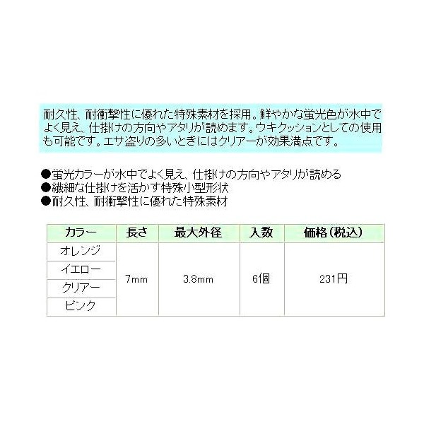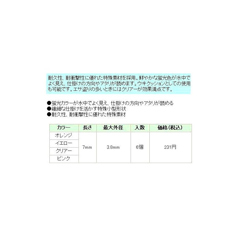 - Sharkfin to ukigomu ■ Total Length (mm): 7 ■ ■ Outside Diameter (mm): 3.8 Quantity (pcs): 6 ● Delicate for the fishing rod and fishing with a vital – Fukase ukigomu ● and according to the fishing method "Uh" and "Uh 4 Color visibility, durability, employs a special material with excellent impact resistance
