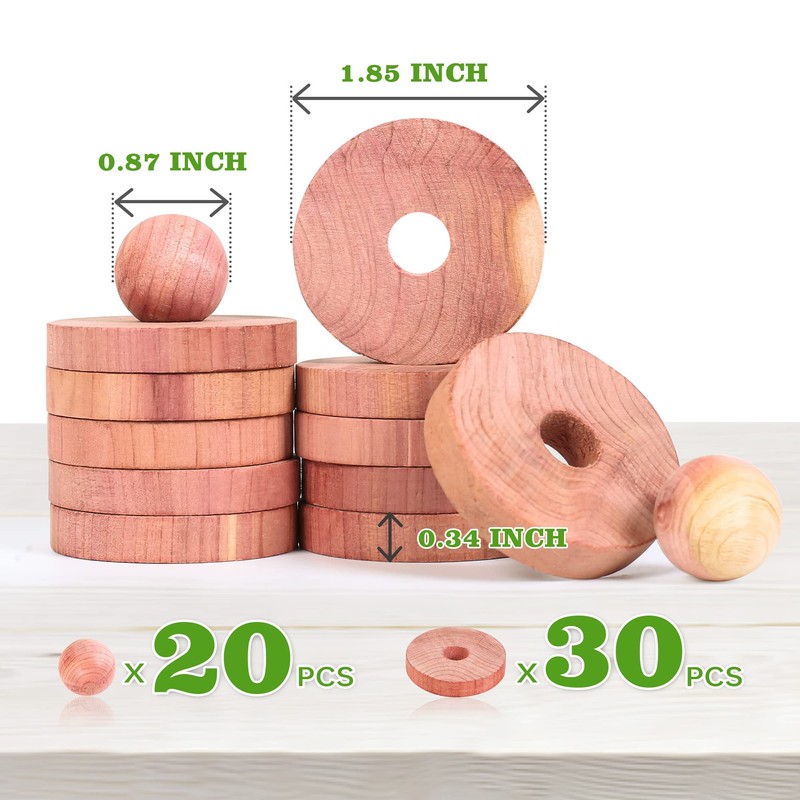 - [Healthy Way] With balls’ diameter of 0.87in(2.2cm) and rings’ diameter of 1.85in(4.7cm) the cedar balls can be simply placed in your drawer, wardrobe, or closet. 50 Pack, 30 Cedar Rings & 20 Cedar Balls.