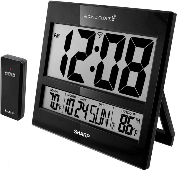 Sharp Atomic Clock – Never Needs Setting, Jumbo 3” Easy-Read Display, Indoor & Outdoor Temperature with Wireless Sensor, Large Digital Wall or Desk Clock, Battery Operated, Auto Atomic Time Sync