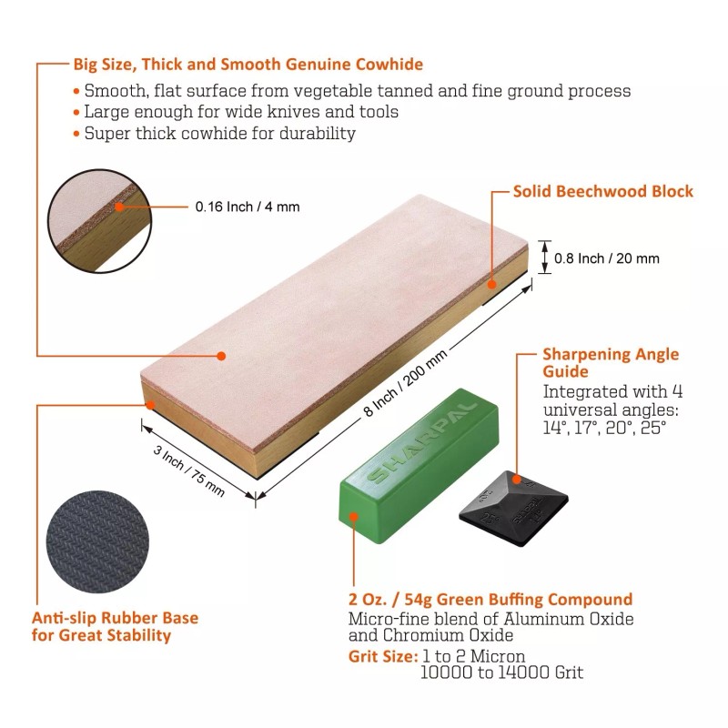 SHARPAL 8"x3" Honing Leather Strop with 2 Oz. Polishing Compound & Angle Guide