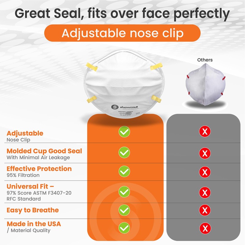 SECURE FIT FOR A WIDE RANGE OF FACE SHAPES AND SIZES : Shawmut's US-engineered molded-cup design and softer flanged edges, this respiratory mask ensures a tight seal, while putting less pressure across all various face shapes and sizes. This design also makes it easier to breathe and talk, providing cooler, fresher air inside the cup for comfortable all-day wear.