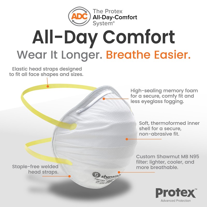 SUPERIOR ALL-DAY COMFORT: Patent-pending Protex ADC system features a high-sealing viscoelastic nose foam band and an aluminum nose clip, providing a snug, comfortable fit that prevents safety glasses from fogging up. The incredibly lightweight yet highly efficient inner filtration layer, combined with expanded force curve double elastic head straps securely stapled for durability, ensures a tight seal and all-day comfort, making it easy to wear and without compromising on safety.