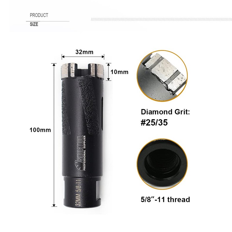 - 1-1/4 inch(32mm) Laser Welded Diamond Dry Drilling Core Bits. Diameter: 32mm(1-1/4 inch), Total length: 100MM, Thread: 5/8 inch-11, suitable for angle grinder