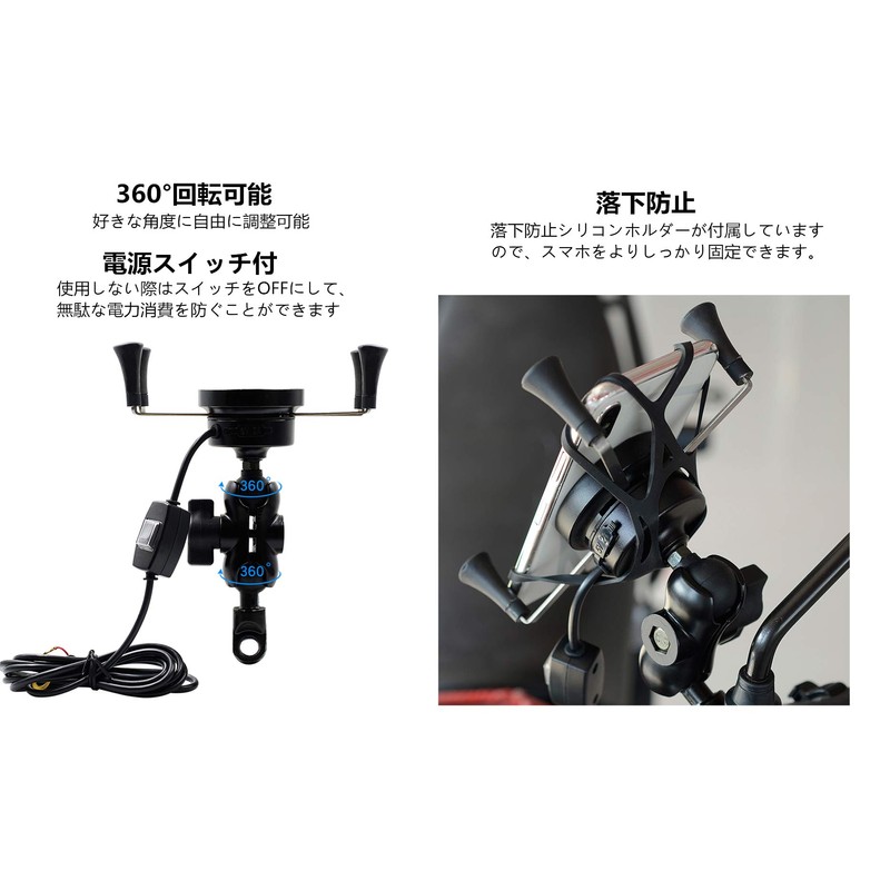 SHEAWA Motorcycle Charger Smartphone Holder, Qi Wireless Charger, 7.5 W, 10 W, Quick Charge 3.0, Fast Charging, 360 Degree Rotation, Aluminum, Power Switch, Car Holder, Can be Mounted on Motorcycle