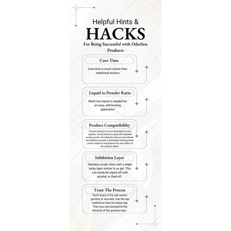 - IF used with standard acrylic liquid, the product will set FAST. ODORLESS ACRYLIC SETS WITH A TACKY/WET LAYER. THIS DOES NOT MEAN IT IS NOT CURED. PLEASE FILE OFF TACKY LAYER OR REMOVE WITH ALCOHOL. YOU WILL SEE THAT THE NAIL IS SET UNDERNEATH.