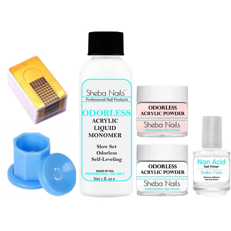 - Odorless Acrylic Liquid Monomer 2 ounce, Odorless Acrylic Nail Powders 1/4 oz White and 1/4 oz Extreme Pink, Non Acid Nail Primer 6ml, Dampen Dish, Nail Forms 10 ct and Instructions