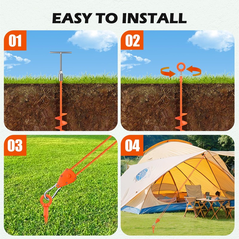 • Ground Anchors Set: This tent stakes kit includes 4 heavy-duty 18" ground stakes, 1 T-handle, and 4 retractable ratchet tie-down straps. Perfect for securing tents, trampolines, swing sets, and carports with ample quantity for various setups