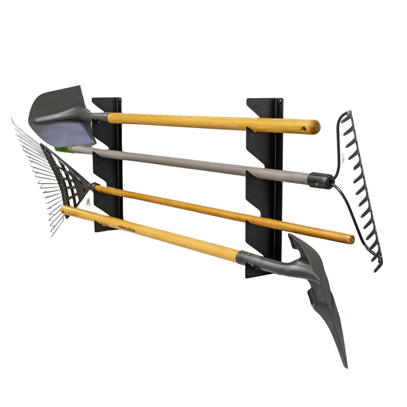 - COMPACT GARAGE ORGANIZER: Organize shovels, rakes, brooms, and other yard and garden tools on a space-saving horizontal tool organizer. Tidy your space by keeping tools off the ground, and keep them in optimal condition for project readiness. The horizontal design ensures your tools are ready to grab and go for your next project.