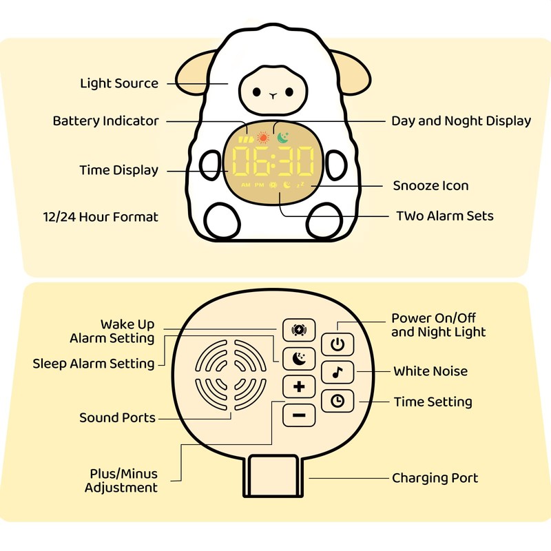 - Gentle Sleep Training – This kids alarm clock teaches healthy sleep habits with color-guided signals: a red light with 30-minute white noise for bedtime, a sunrise-mimicking yellow light 30 minutes before wake-up, and a green "go" light when it's time to start the day.