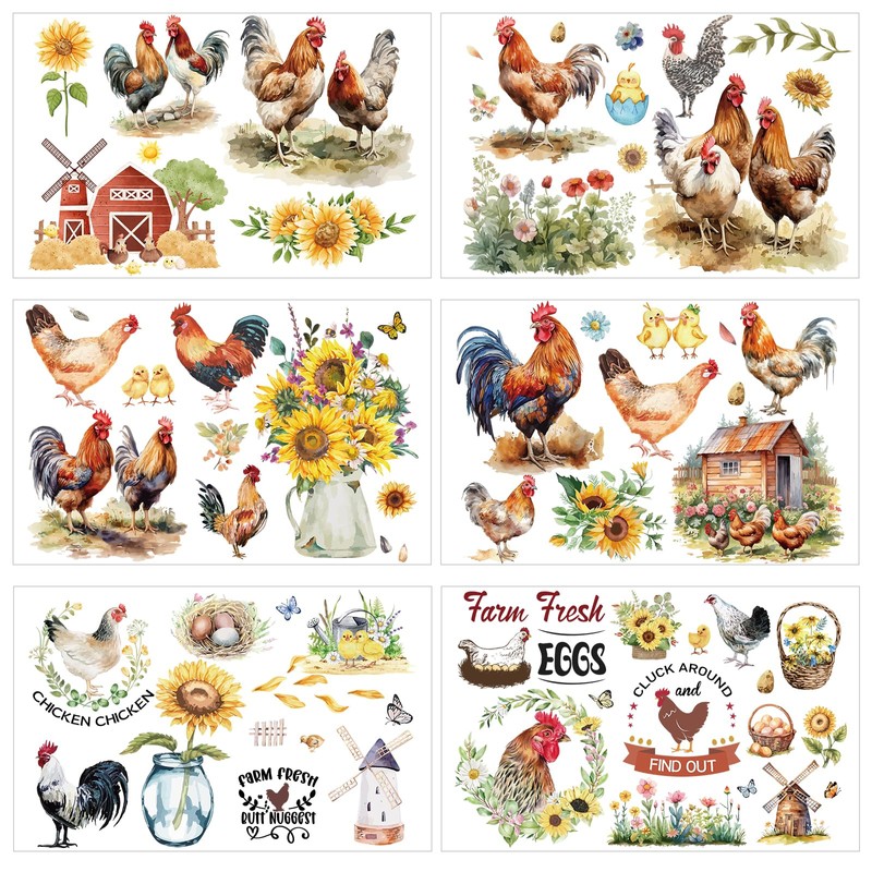 Shejdgart Chicken Rub on Transfers for Crafts - 6 Sheets Farm Rub on Transfer Stickers for Furniture Sunflower Rub on Transfers for Wood Glass Scrapbook DIY Home Decor 11.8x7.9 Inch