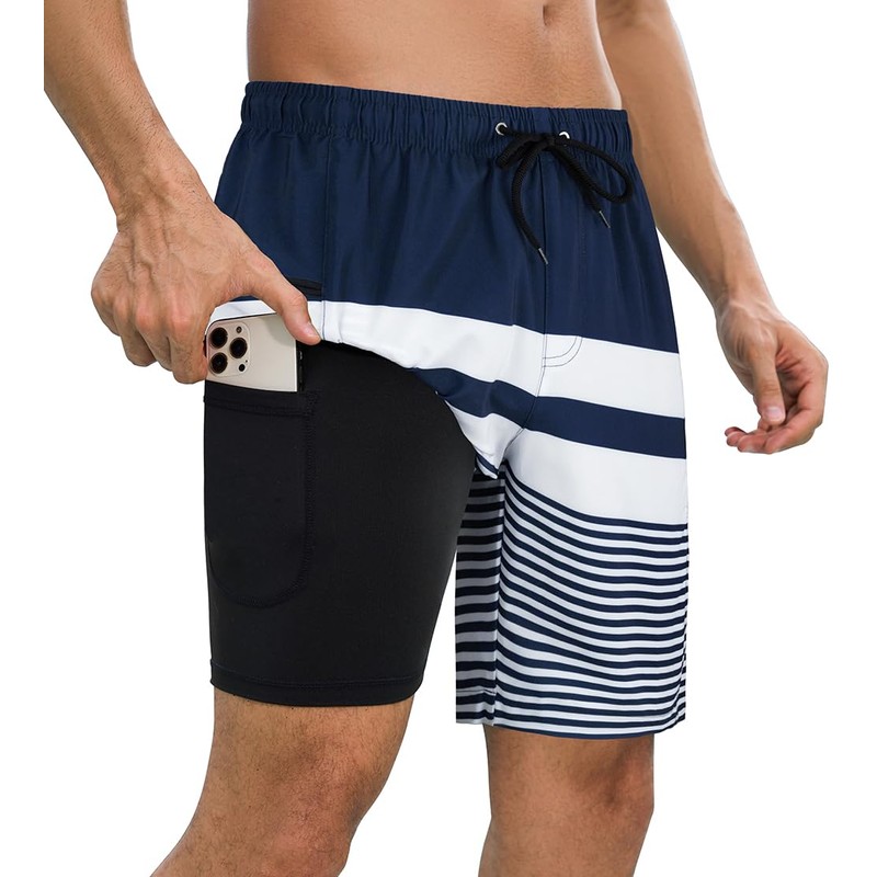 SHEKINI Mens Quick Dry Swimming Trunks with Compression Liner 2 in 1 Beach Shorts with Zip Pockets, Blue White, Large