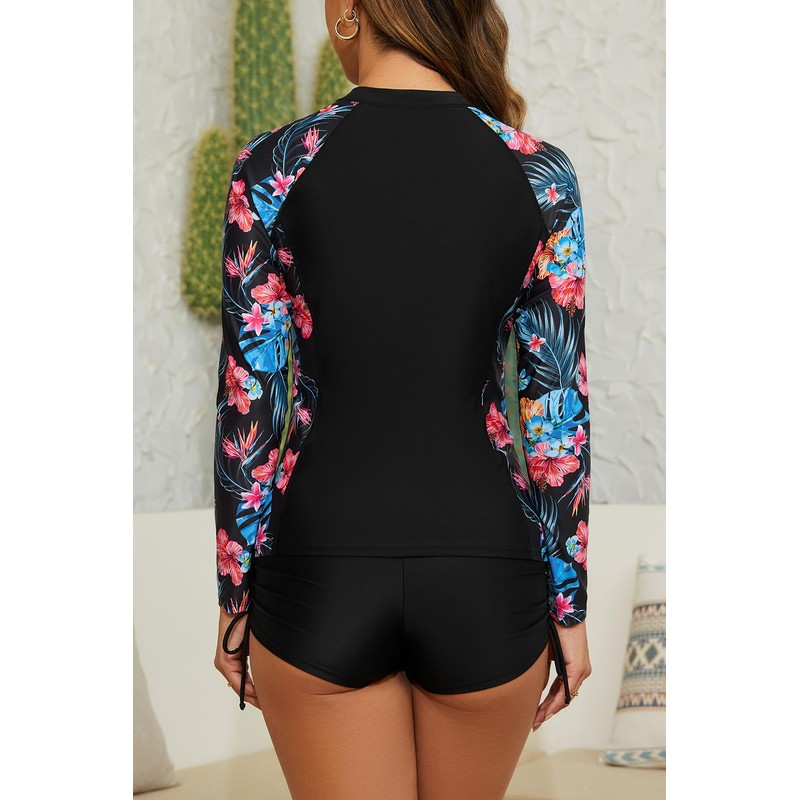 SHEKINI Women's 3-Piece Rash Guard Long Sleeve Swimsuits with Drawstring Short, Black+Flower