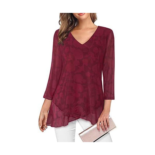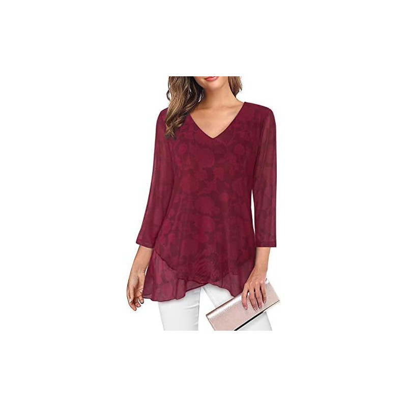 SHEKINI Womens Dressy Tunic Tops V Neck 3/4 Sleeve Blouse Double Layers Cross Hem Shirts Loose Flowy Summer T Shirts S-3XL Burgundy