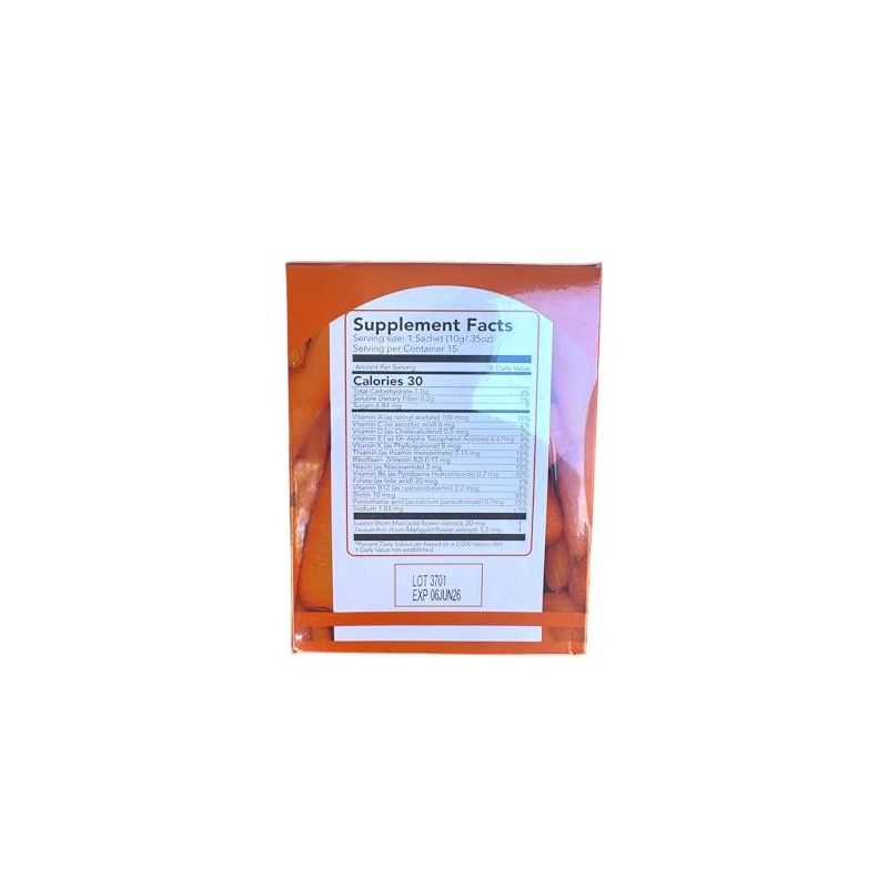 Lutein & Zeaxanthin Peach and Carrot Flavor sachets are a convenient way to supplement your diet with essential nutrients. Each 0.35 oz. sachet provides 20 mg of lutein and 1.2 mg of zeaxanthin, derived from marigold flower extract. These antioxidants support eye health and vision. The sachets also contain a blend of vitamins and minerals, including Vitamins A, C, D, E, K, B1, B2, B3, B6, B12, folate, biotin, and pantothenic acid. With a delightful peach and carrot flavor, these sachets offer a tasty way to nourish your body. The box contains 15 individual sachets, making it easy to incorporate into your daily routine. Simply mix the contents of one sachet with water or your preferred beverage for a nutritious boost.