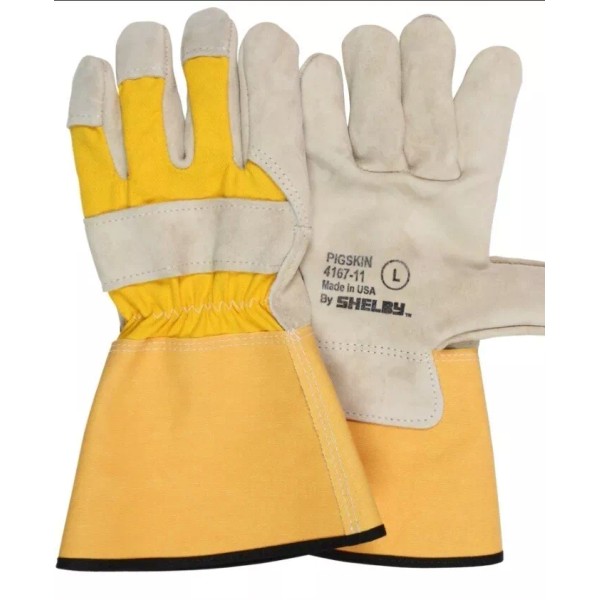 Size L. Shelby 3 oz Buttermilk colored brushed pigskin, full leather palm, wing thumb, knuckle strap and index finger, wrist shield, cotton flannel palm inside and shirred elastic back with 4½ inch rubberized gauntlet cuff. Made in USA.
