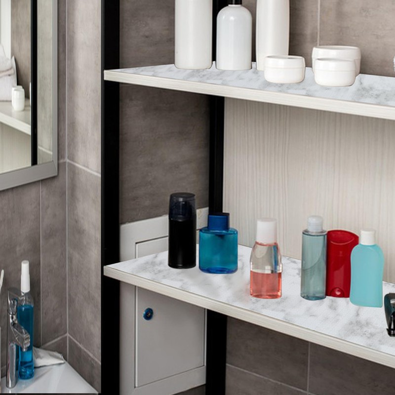 - HIGH QUALITY MATERIAL-The shelf liners are made of high quality food grade material without plastic chemical smell, could contact the fruits and other food directly. With the marble pattern printed could match your kitchen decor perfectly. Well made, could Lay flat on the cabinets without curling.