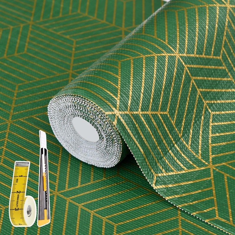 Shelf Liners for Kitchen Cabinets 12in x 20FT, Non Adhesive Cabinet Liner Strong Non-Slip Thickened Gold Green Geometric Drawer Liner, Easy to Clean for Shelf, Cabinet with Knife and Tape Measure