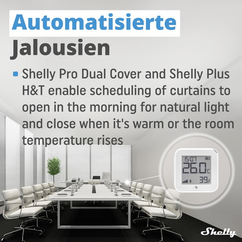 - Automated blinds - Controlling motorised blinds, curtains and roller shutters can significantly improve privacy, energy efficiency and safety in the home. With Shelly Pro Dual Cover / Shutter PM, you can open, close and adjust your curtains and shutters according to your own needs and preferences.
