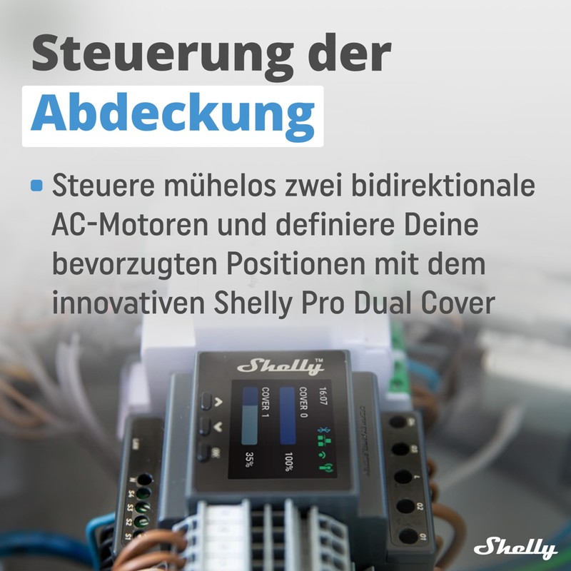 - Shelly Pro Dual Cover/Shutter PM is a professional, intelligent controller for roller shutters and blinds on DIN rails with power measurement functions and LAN, Wi-Fi and Bluetooth connection. Cover control for roller shutters, awnings, gates, cabinets, sliding doors, curtains.