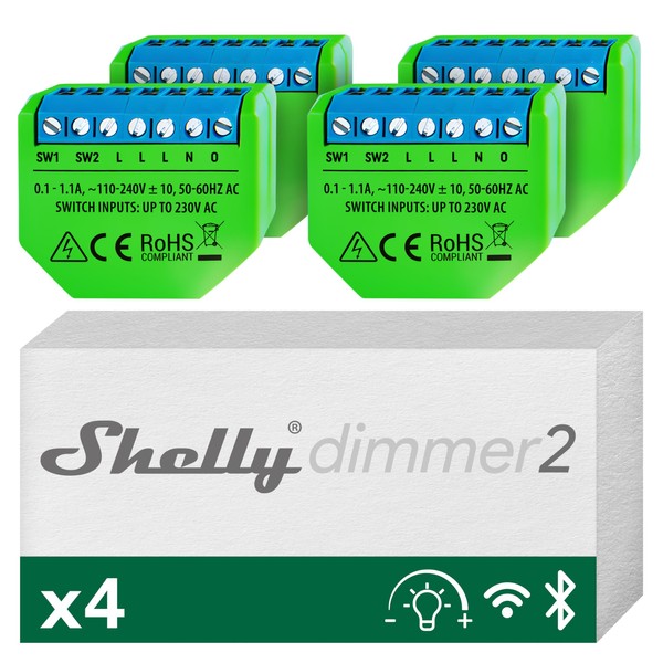 Shelly Shelly Dimmer 2, Intelligenter Wlan Dimmer, Kein Neutralleiter n?tig, Hausautomatisierung, Kompatibel mit Alexa & Google Home, iOS Android App, Kein Hub erforderlich, Dimmbare Lichter (4 Stck)