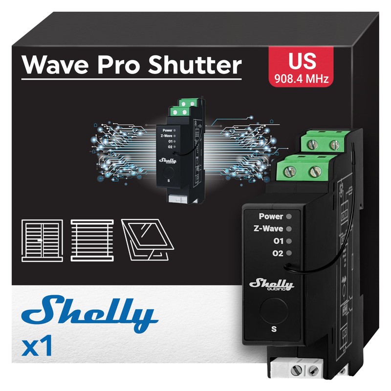 • Shelly Wave Pro Shutter - Professional DIN rail Z-Wave shutter control with power metering, 16A per channel. Ideal for automating motorized blinds, shutters, venetian blinds, and awnings. Mounts inside a breaker box. Recommended for use with motors having electronic or mechanical limit switches.*A gateway (smart hub) is not included. A gateway (smart hub) is required for the configuration of the device.​