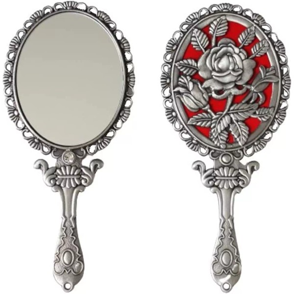 SEHAMANO - Espejo de mano clásico con rosa en relieve en la parte posterior, espejo de metal compacto para maquillaje, espejo pequeño (lata (plata mate)