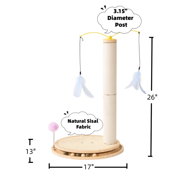 SHENGOCASE Cat Scratching Post Scratcher, 26 Inch Tall, Solid Wood Base,Sisal Rope, Interactive Ball Track and Spinning Wand Feather Toys, Scratch Pad