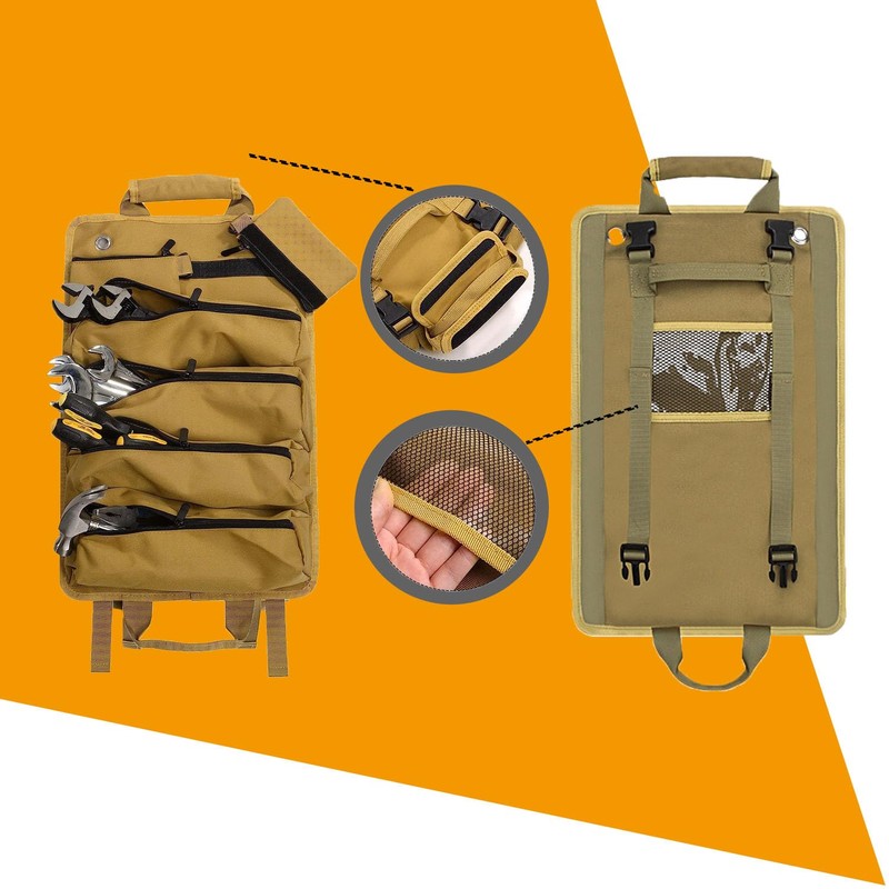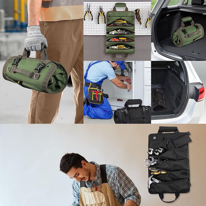 - 【Functionality】Multi-purpose rolling tool organizer, light in weight and small in size, as a tool carrier, it can accommodate such as drills, pliers, wrenches, gloves, screwdrivers etc, unlike hard shell cases that take up too much space, roll up bag will save more room and keep messy accessories organized.
