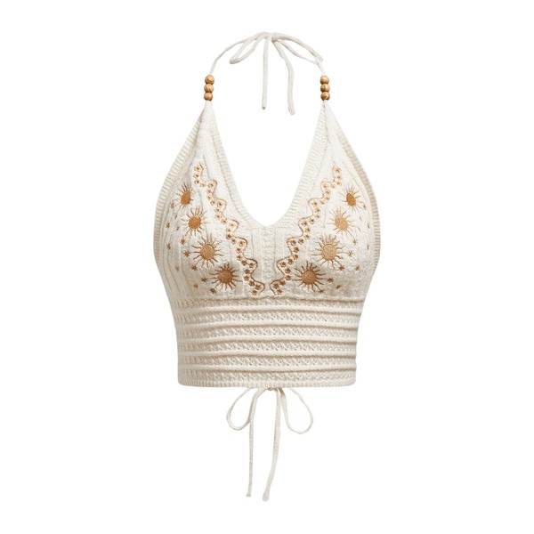 SHENHE Women's Open Back Knitted Halter Crop Top Tie Backless Embroidered Hippie Top Apricot Medium