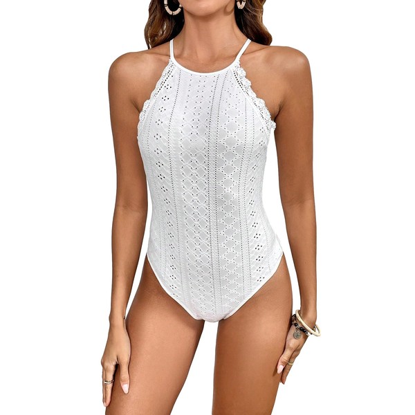 SHENHE Women's Solid Halter Neck Contrast Lace Eyelet Embroidered Sleeveless Bodysuit, White, Small