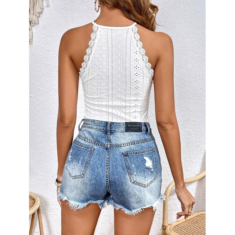 - Features: halter neck bodysuit, eyelet embroidery, lace trim, sleeveless
