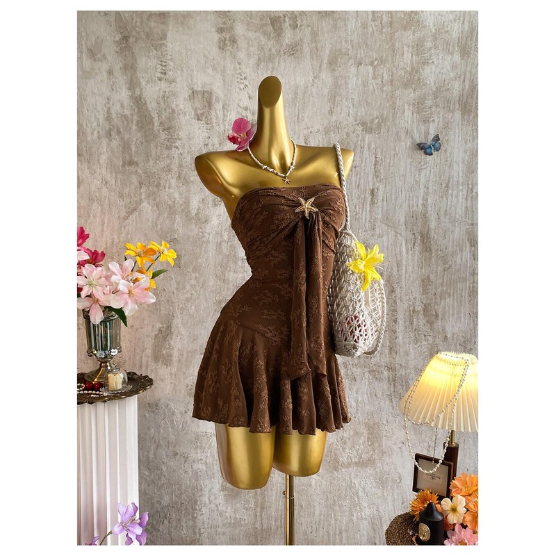 - Features: Strapless ruffle hem mini dress for women, textured, starfish-shaped metal decor, drop waist, hippie aesthetic, short tube top dress, flared hem