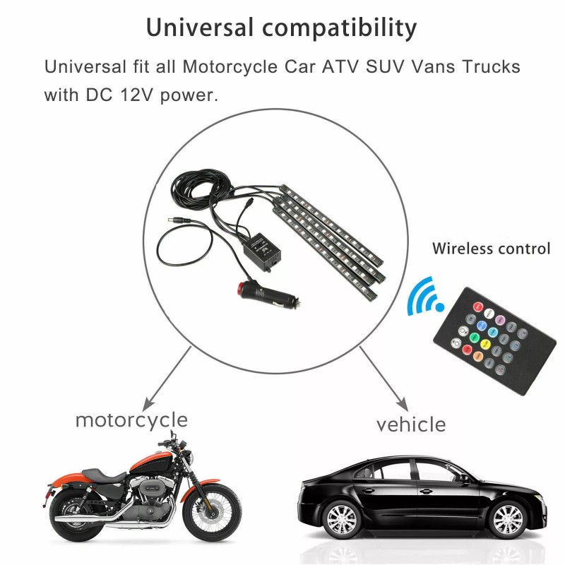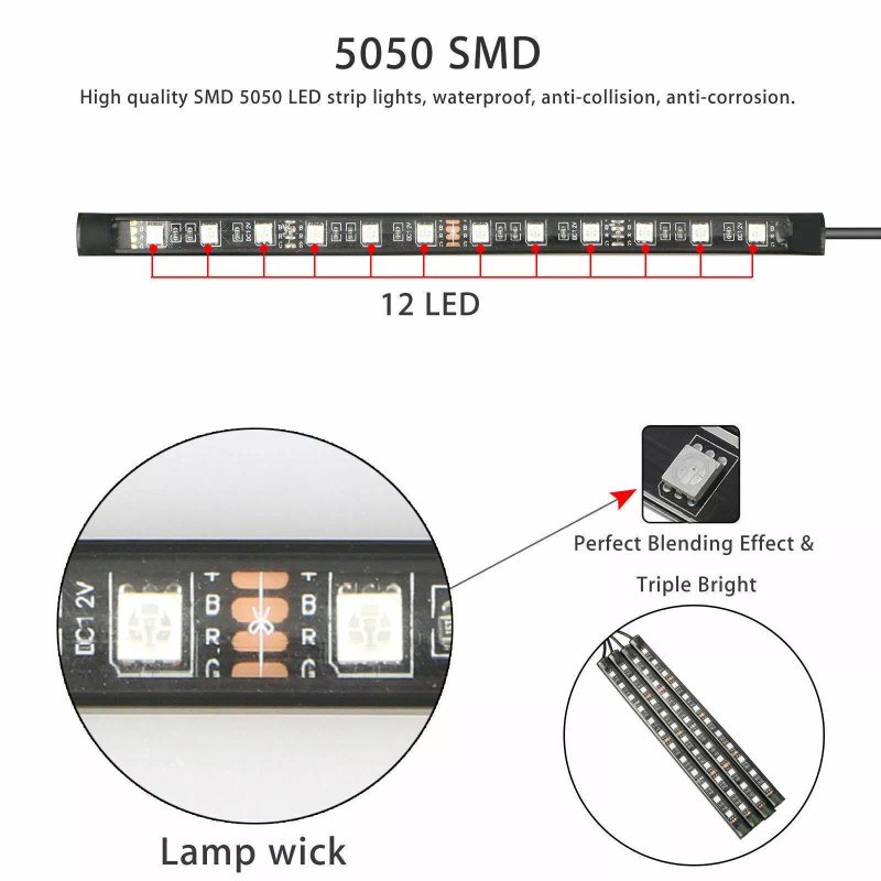 - LED type: 5050 SMD; Numbers of LED: 48pcs (4 Tube, 12 LEDs per tube); Fits all Cars with DC 12V power.