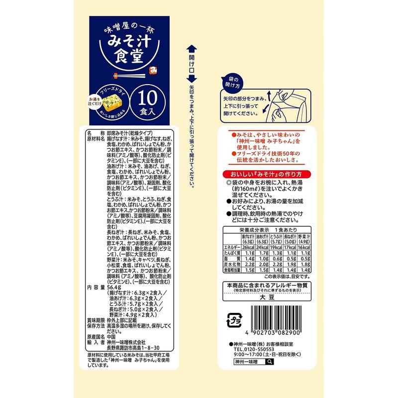 - Ingredients: Fried eggplant juice: Miso, fried eggplant, onion, salt, wakame, bajimi glute, bonito extract, bonito powder, seasoning (amino acids), antioxidants (vitamin E), (some ingredients contain soybean), Tofu juice: Rice miso, tofu, onions, salt, wakame, bajiri starch, bonito extract, bonito powder. Powder/Seasoning No acids, etc.), coagulant for tofu, antioxidant (vitamin E), (some contains soybeans), long onion juice: onions, rice miso, salt, wakame, bajo starch, bonito extract, bonito powder/seasoning (amino acids, etc.), antioxidants (vitamin E), (some ingredients include soybean), vegetable juices: rice miso, cabbage, small pine onion. Vegetables, salt, roasted Clean starch, bonito extract, bonito powder, seasoning (amino acids, etc.), antioxidant (vitamin E), (some ingredients contain soybean); Oil juice: rice miso, oil, onions, salt, wakame, bare-soybean powder, bonito powder, seasoning (amino acids), coagulant, antioxidants (vitamin E), (some parts include soy). )