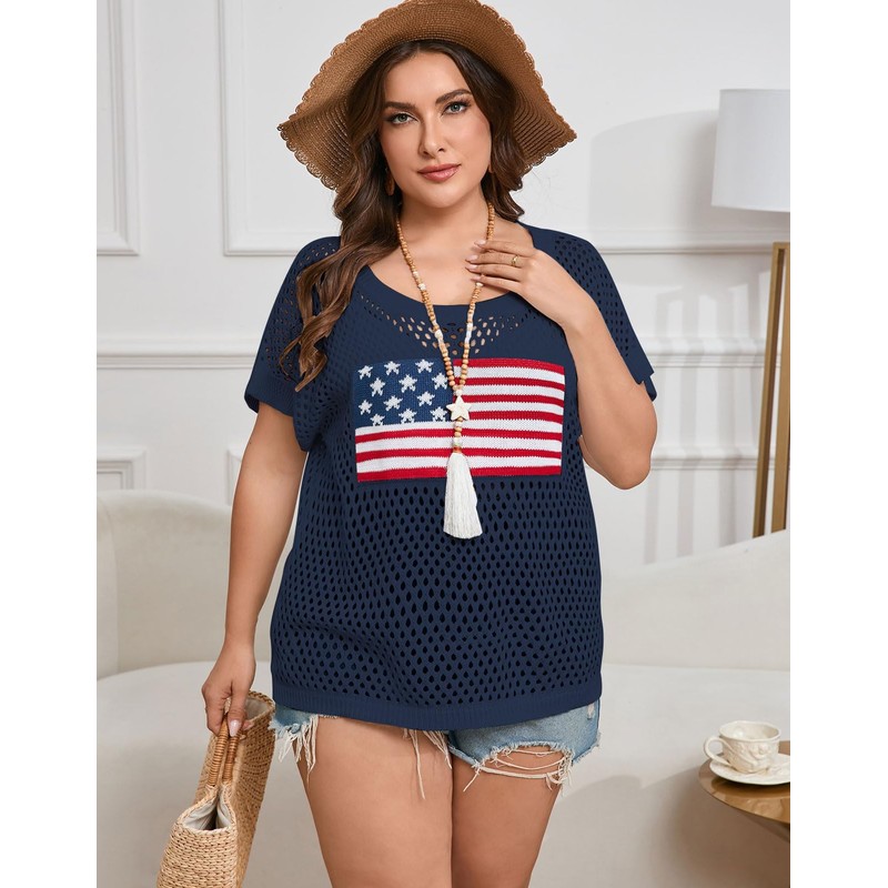 shermie Women's Short Sleeve Scoop Neck Crochet Top Plus Size American Flag Swimsuit Cover Up (Navy,3X-Large)