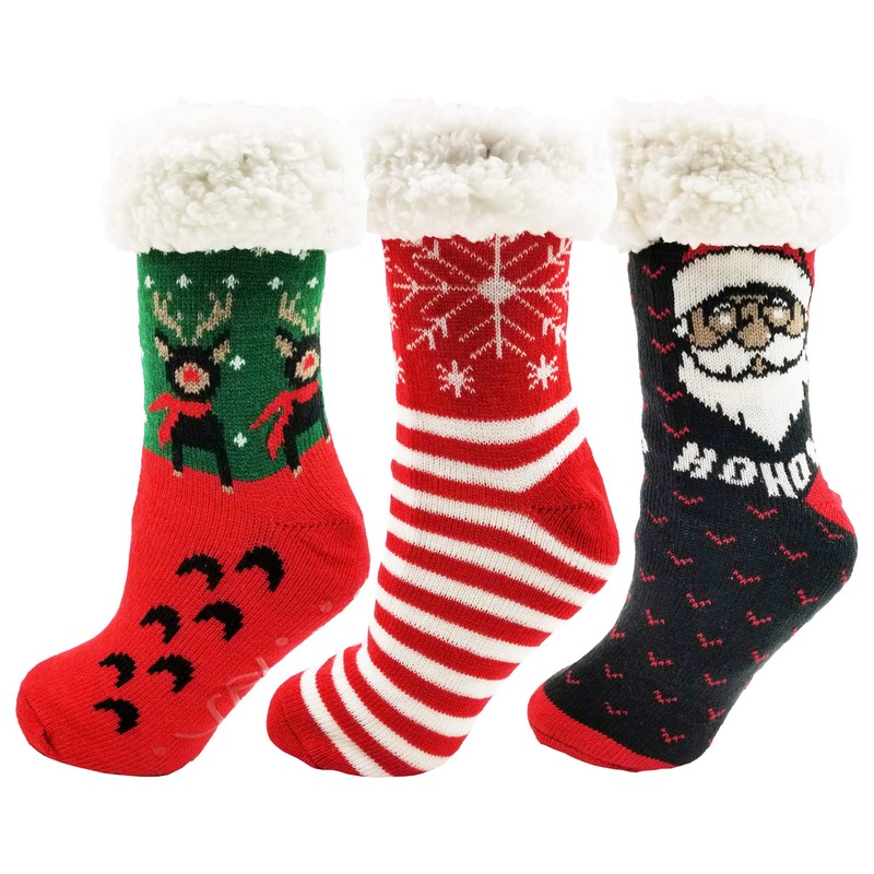 Sherpa Lined Slipper Socks, 3 Pairs for Women, Fluffy Christmas Winter Patterned with Gripper Bottoms, Warm Soft & Comfortable (Christmas A)