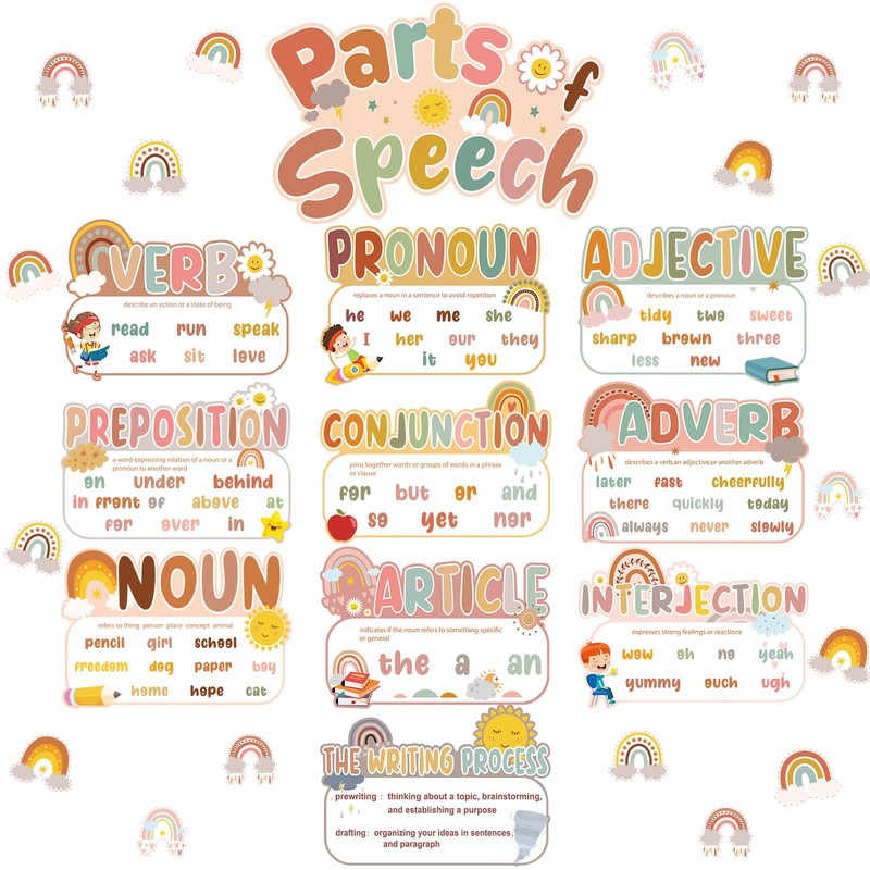 - Practical Speech Bulletin Board: school speech charts posters provide detailed explanation to help students recognize and learn the parts of speech, they'll be able to analyze, understand and construct sentences, which is a good way to teach the concept of rhetoric language, and they come in handy when students are reading or writing