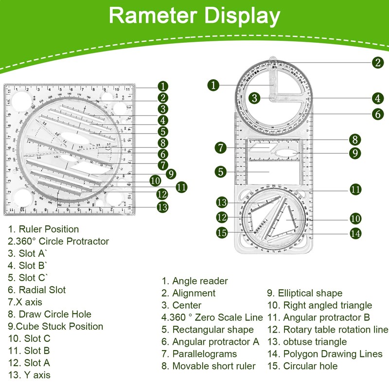 - School and drawing tools: The geometric ruler set is suitable for drawing circles, measuring angles (0° ~ 360°), measuring lengths, etc. It is an indispensable learning tool for all kinds of craft drawing and technical drawing. It can also be an ideal gift for architects, students, teachers, designers or craftsmen.