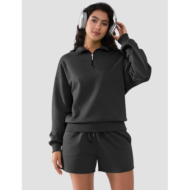 - Upgrade Your Style: Chic quarter-zip sweatshirt & high-waist shorts set; Versatile 1/4 zip: unzip for breezy V-neck style or zip up for warmth. Flattering drop shoulders + ribbed cuffs; Shorts feature elastic waistband, drawstring & dual pockets