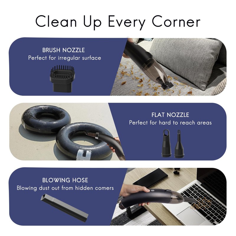 - đăMultifunktionaler Autostaubsauger kabellosăAusgestattet mit einer Vielzahl von Saugköpfen und MundstĂŒcken, sorgt es dafĂŒr, dass Sie alle Bereiche reinigen können, um Ihren unterschiedlichen BedĂŒrfnissen gerecht zu werden.