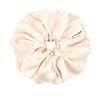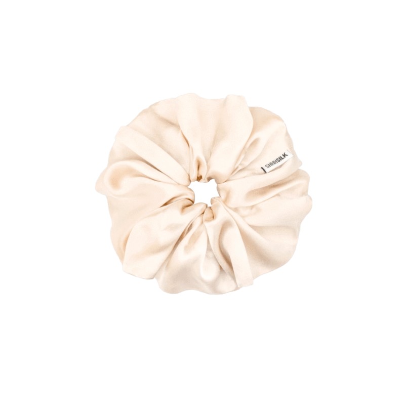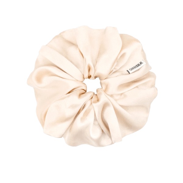 Shhh Silk Oversized Nude Silk Scrunchie is a luxurious hair accessory made from 100% mulberry silk that helps prevent hair breakage and kinks while adding a touch of elegance to any hairstyle.
