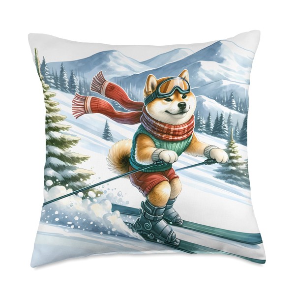 Shiba Inu Skiing Down Snowy Mountain. Dog Snow Goggles Scarf Throw Pillow