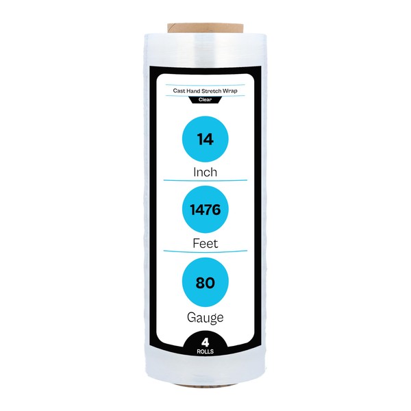 - SPECS - You will receive 4 rolls of clear stretch wrap. Each roll is 14 inch tall by 1,476 feet in length. Thickness is 80 gauge.