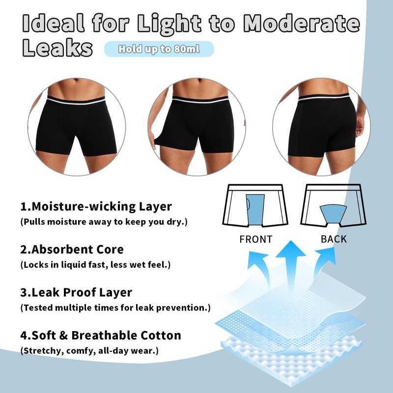 - Daily Leak Solution: Washable incontinence underwear for men features a built-in four-layer high absorption efficiency pad for absorbing 120-150ml continuous flow. Mens leakproof incontinence underwear ideal for light to moderate urinary incontinence