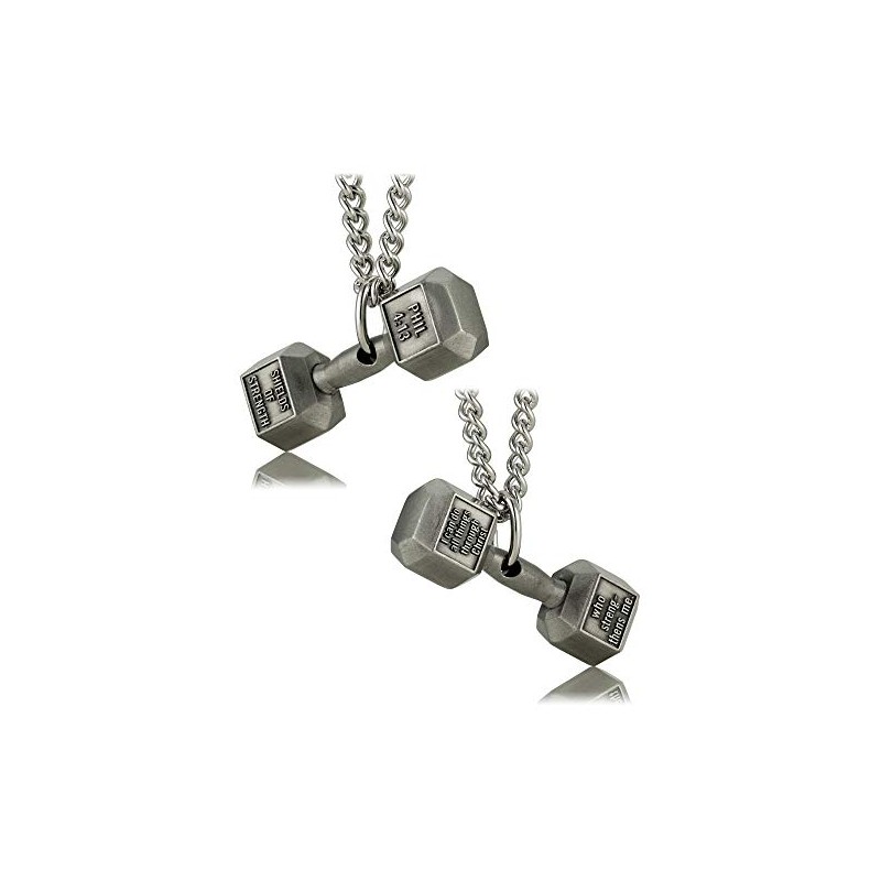 - DESIGN - Keep the promises of God close to your heart with the men's antique finish dumbbell necklace from Shields of Strength. This beautiful piece of jewelry features a dumbbell-shaped pendant that hangs on a stainless steel chain. This necklace is an excellent gift for athletes who value physical and spiritual health. Shields of Strength is a Texas based company. We stand behind our designs