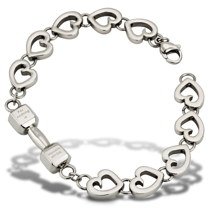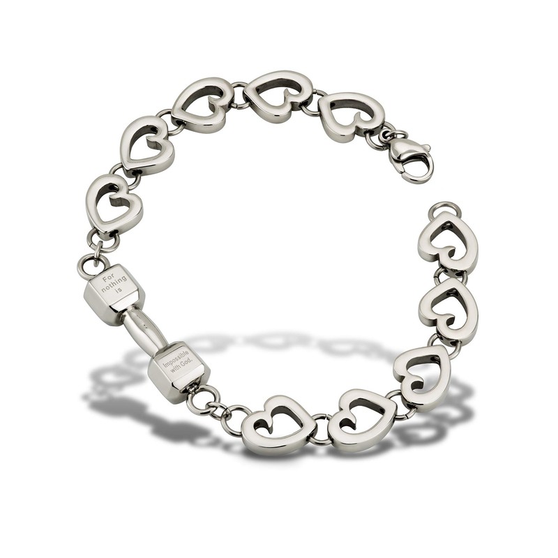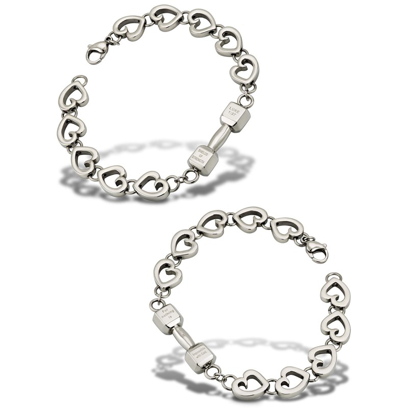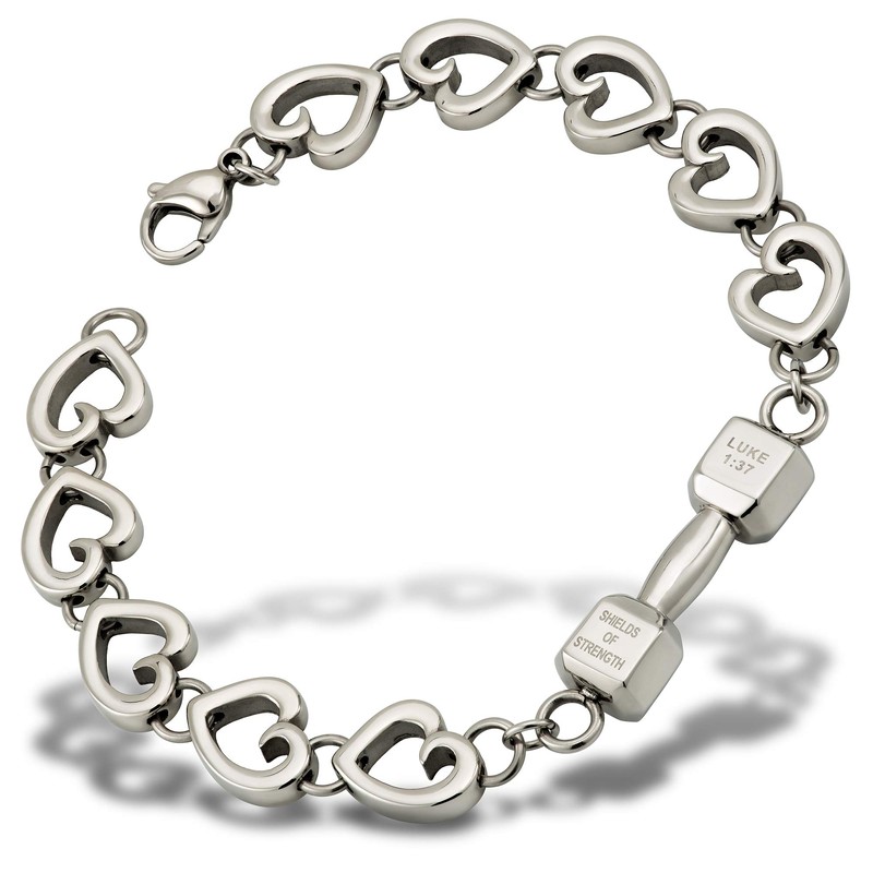 - DESIGN - The Shields of Strength women's stainless steel love fitness bracelet with mini dumbbell is the perfect way to express a love that is both timeless and unconstrained by the burdens of daily life. The beautiful piece of Christian jewelry features a small dumbbell pendant inscribed with the words of Luke 1:37. This powerful, motivational Scripture is a constant reminder that God is always present, lending strength, guidance, and love.
