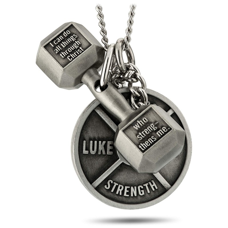 - SCRIPTURE - Inscribed on the dumbbell is Philippians 4:13, “I can do things through Christ who strengthens me.” Inscribed on the Weight Plate is Luke 1:37, “For nothing is impossible with God."