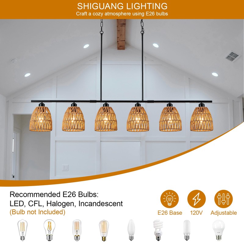 SHIGUANG Boho Rattan Chandelier for Dining Room Light Fixture, 6-Light 53 Inch Farmhouse Rustic Kitchen Island Lighting, Hanging Lights Fixture Over Table with Hand Woven Lampshade, Height Adjustable